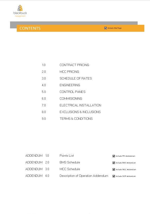 Based in XL for maximum design flexibility and familiarisation the suite of tools allow you to quickly select pre assembled KITS, place them on to your MCC page to create a PTS list, Controls Selection, MCC schedule, WIRing estimate all in one hit. This populates all the relevant fields in the Tool from the DASHboard where rates for labour, commissioning and engineering are held right through to the PROPOSAL with its selectable ADDENDUMS ready to be sent to the client in a .pdf file.